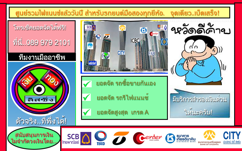 ศูนย์รวมไฟแนนซ์แล้ววันนี้ สำหรับรถมือสองทุกยี่ห้อ โทรเช็คยอดจัดได้ฟรีทีนี!089 979 2101 เบอร์เดียว24ชั่วโมง